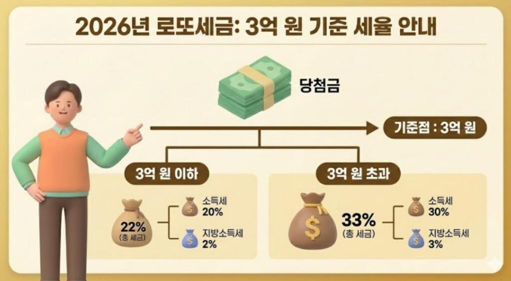 국내 기사·금융사 설명 자료에서도 공통적으로, 로또·복권 당첨금은 3억원 이하 구간은 22%, ‘3억원 초과 구간은 33%’로 원천징수된다고 정리합니다. (소득세+지방소득세 합산 기준)